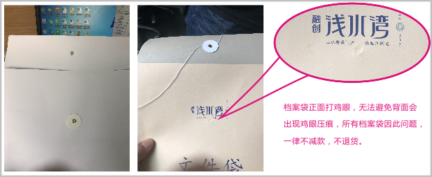 檔案袋正面打雞眼,無法避免背面會出現雞眼壓痕,所有檔案袋因此問題,一律不減款,不退貨。